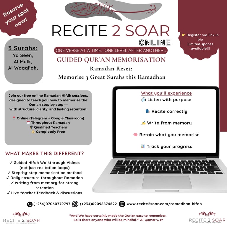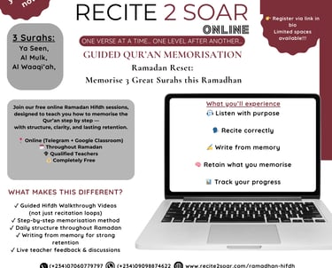 This Ramadhan, Recite 2 Soar invites you to experience our memorisation method through a free guided hifdh programme.